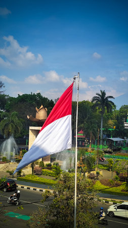 A close-up of the Indonesian flag flying over a busy street intersection and a green public square, with lush trees and a sculptural element visible in the background.