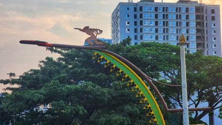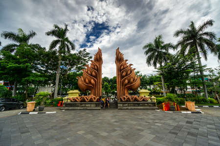 Heroic monument statue garden symbolized by traditional bamboo weapon as the landmark of Surabaya City in the middle of the road