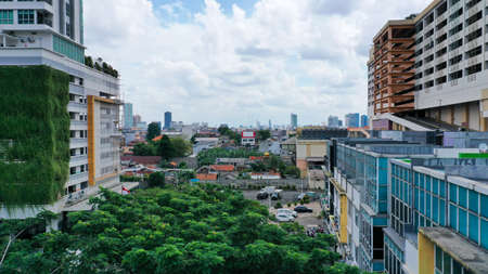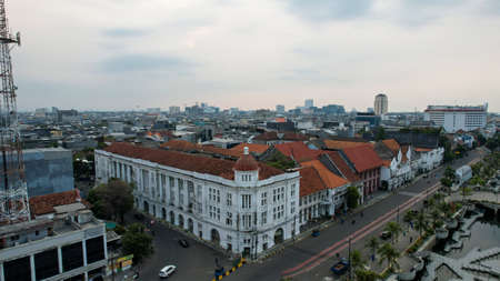 Aerial view of Jakarta cityscape background at Kota Tua, Batavia old cityJAKARTA, INDONESIA - DECEMBER, 30, 2020