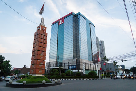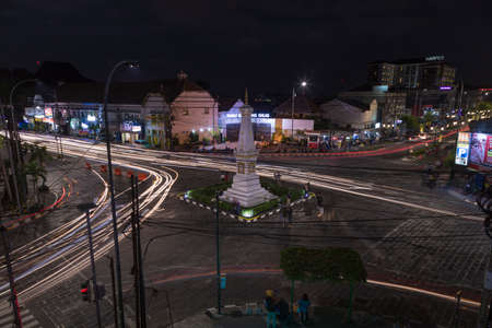 Yogyakarta, Indonesia - July 16, 2019: Tugu, famous symbol that represents the city of Yogyakarta, is surrounded by night traffic