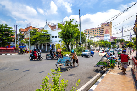 Traditional transportation of becak (rickshaws) in the old town Jembatan Merah, Surabaya