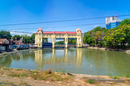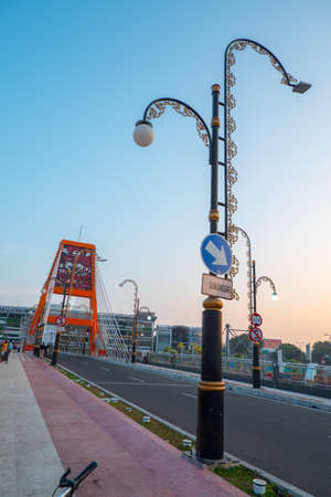 Surabaya, Indonesia - May 16, 2021: Sawunggaling Bridge, Surabaya with orange color in the morning
