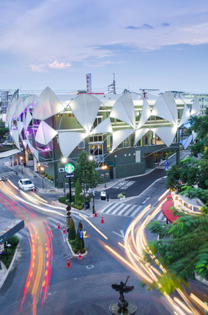 Editorial: Bangkok City, Thailand, 26th March 2017. Starbucks Coffee is the popular coffee shop in the world with city scape from high view and customer car park with long exposure at night in Bangkok Thailand.