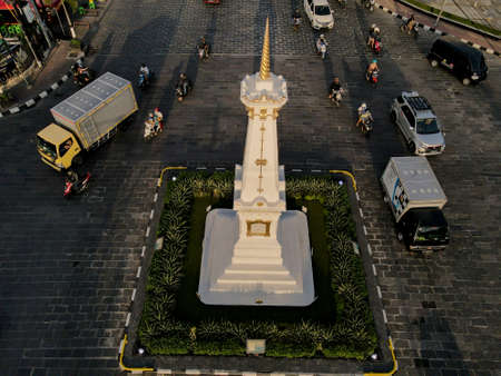 Aerial view of the tugu jogja or known as tugu pal is the iconic landmark of Yogyakarta. Central Java, Indonesia, July 1, 2021
