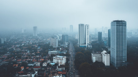 Aerial view of a bustling city landscape shrouded in mist, featuring modern skyscrapers and a busy road below. Perfect for showcasing urban life in diverse environments.