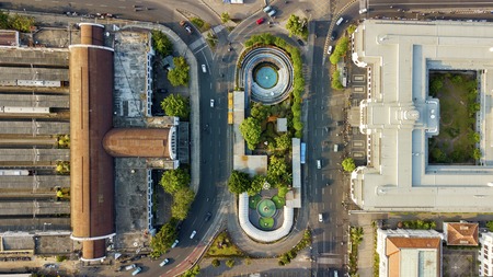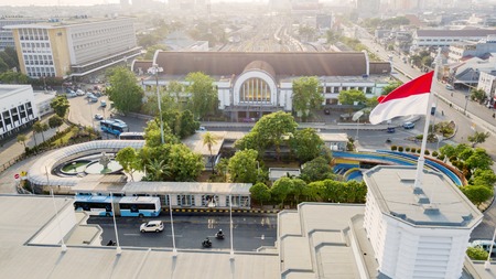 JAKARTA - Indonesia. September 04, 2018: Top view of Jakarta Kota Train Station near Mandiri Museum building in Jakarta, Indonesia