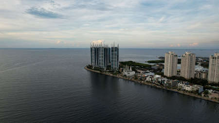The cityscape of Jakarta city in Indonesia with a view at the sea, port, palms, apartments reflected on the water surface. Jakarta, Indonesia, May 5, 2021