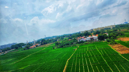 Green paddy field and modern city skyline