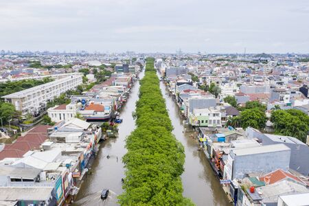 Aerial view of the river flows through the Jakarta city at day time