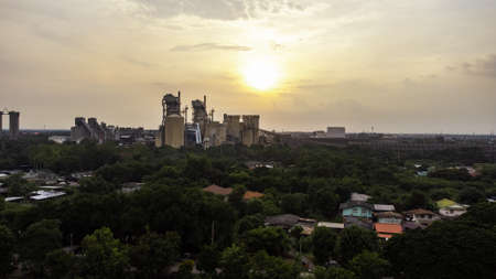 Roofs of Factory buildings in heavy industrial with white smoke against orange sky during sunset. Aerial photo view by drone from top of plant.