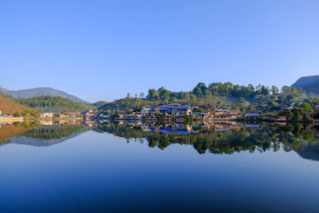 beautiful lake with reflection of water in morning time at ban rak thai chinease refugee village at Mae Hong Son Thailand