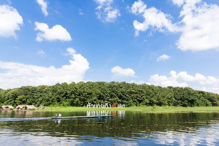 Sangkhlaburi - March 05, 2017: The scenery of floating village and a part of temporary bamboo bridge the river in Sangkhlaburi District, Thailand, in the early morning.