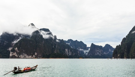 The small tail-machine boat bring group of tourist to another side of mountain, Khao Sok Suratthanee Thailand