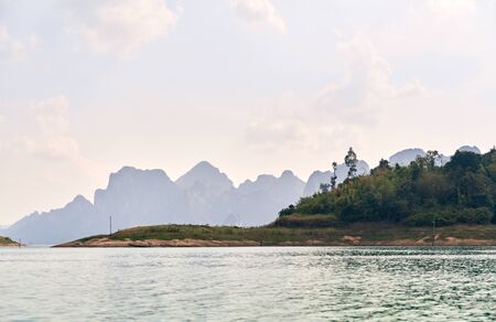Shadow of limestone mountain range and lake in the morning light with mist and clouds in Khao Sok National Park in Surat Thani, Thailand.