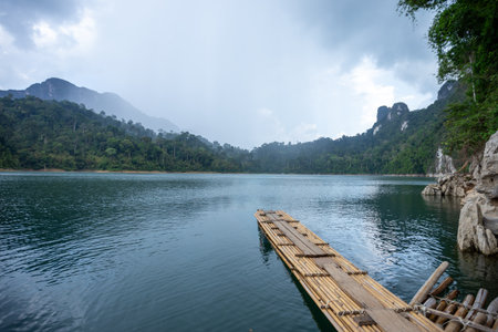 Beautiful view of wooden bridge in front of the meadow, turquoise lake, mountain and sky in summer with reflections in a lake at Ratchaprapa Dam and Cheow Larn Lake, Khao Sok, Suratthani, Thailand.