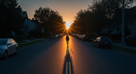 A person walks away from the camera down a sidewalk in a quiet suburban neighborhood during the golden hour. Large oak trees cast long shadows across the green lawns and street, framing the row of traditional houses. The scene evokes a sense of peace and everyday life in a residential area.