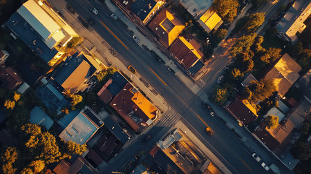An overhead view reveals a suburban neighborhood comprised of houses and trees. The scene displays a variety of colors, featuring warm tones and varying textures. The composition creates a sense of depth, suggesting an outdoor environment during the day, suitable for various editorial and commercial applications.