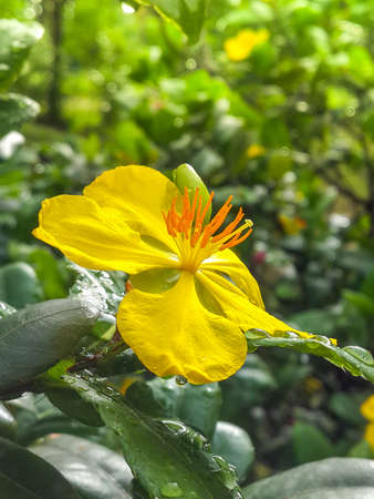 Closeup and Selective focus on yellow Oxalis flowers in the garden on springtime, with some water drops, against green background