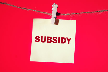 Business concept. SUBSIDY word on a yellow sticker suspended from a rope in front of a red background