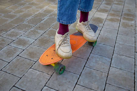 Children's feet in sneakers close-up on a skateboard on Pavement. Physical development of children.