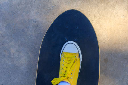 Close up top view Yellow sneakers stepping on surf skate board at park on morning.