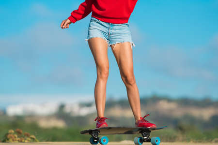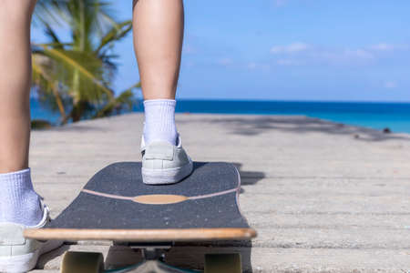 Cropped shot of legs on longboard. Skater girl riding her skateboard on street. Female teenager on cruiser