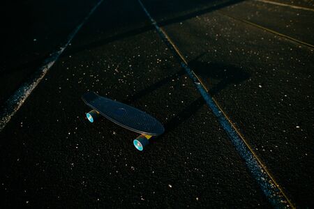 Black penny skateboard on the black sport field.
