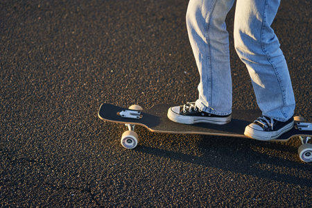Skateboarder legs riding on skateboard on city street at sunset