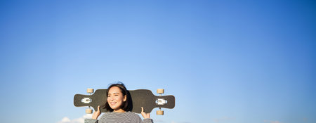 Vertical shot of carefree asian girl with longboard. Young woman skater holding cruiser on her shoulders and walking on road, skateboarding