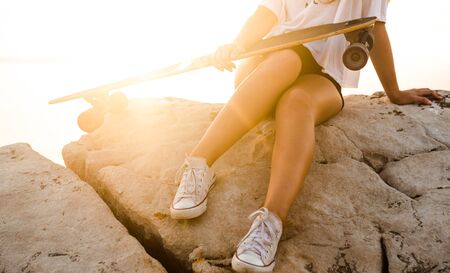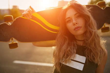 Beautiful and fashion young woman posing at teh sunset with a skateboard - File a little bit noisy