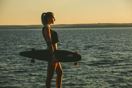 Silhouette of a beautiful, sexy hipster girl in tattoos standing with a longboard against the sunset at the sea.