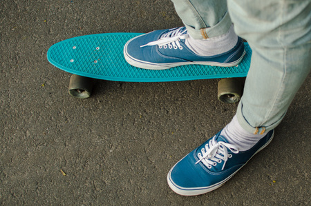 Top view of the blue canvas shoe standing on the blue plastic penny board outdoors. Concept of the modern transport solutions, commute.