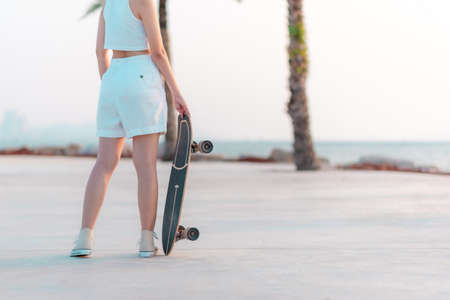 Surf Skate,women playing extreme sport with four wheels on board sliding on street beach summer background