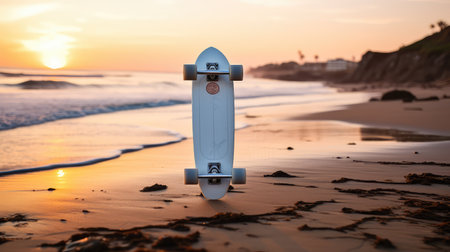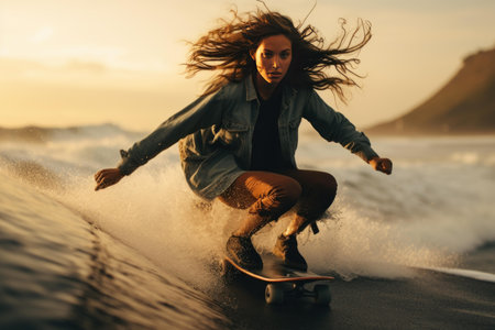 Dynamic image of a woman skateboarding with skill along a sandy shore with waves and sunset in the background