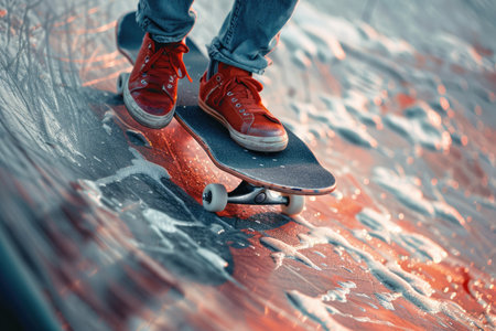 Skateboarder riding on a vibrant wet surface with rainbow colors and splashing water droplets. Extreme sport lifestyle concept