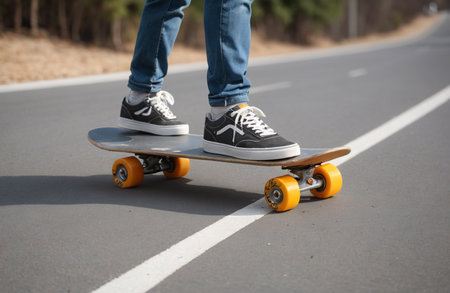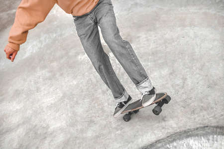 skateboarder legs riding on skateboard on the asphalt road