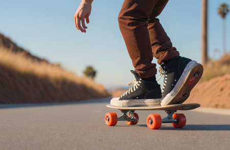 Close-up shot of a skateboarder performing a trick on a sunny day near the beach. Captures movement, youth culture, and street lifestyle in a palm-lined setting.