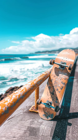 The skateboard leans against a weathered railing, overlooking the glistening waves of the ocean. The bright sky enhances the serene coastal atmosphere, inviting adventure and freedom.