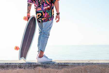 stylish skater in trendy outfit holding skateboard