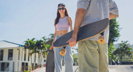 Young happy couple with skateboards enjoy longboarding at the skatepark