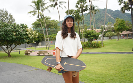 Bangkok, Thailand - April, 07, 2022 : Close-up Asian girl surf skate or skates board outdoors on beautiful summer day. Happy young girl play surf skate at park on sunset time at Bangkok, Thailand
