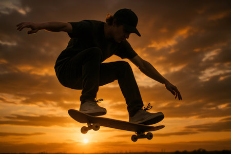 Silhouetted skateboarder launching into a jump at sunset, surrounded by a vibrant orange sky and wispy clouds, capturing the spirit of freedom