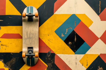 Skateboard with orange wheels resting against a colorful urban wall, representing youth culture and urban lifestyle