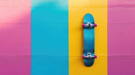 A vibrant skateboard is showcased against a colorful painted wall, featuring bright stripes of blue, pink, and yellow, capturing the essence of urban lifestyle and sports culture.