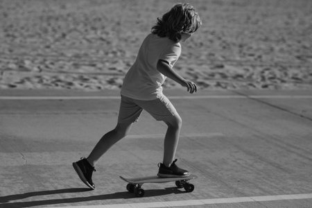 Kid skateboarder ride a skateboard on street. Child in a summer city. Little child, toddler boy riding skateboard in the park for the first time, trying skateboarding.