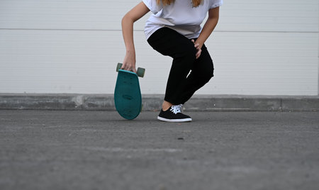 Close-up of feet and knee of girl who stands with skateboard on asphalt