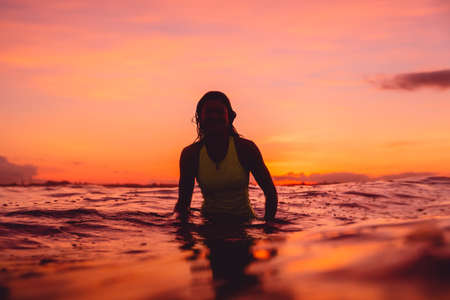 April 16, 2020. Bali, Indonesia. Surf girl ride on surfboard. Surfers in ocean during surfing.