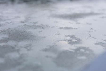 Selective focus. First frost on a frozen car, late autumn close-up. Beautiful abstract frozen microcosmos pattern. Freezing weather frost action in nature. Winter backdrop.
