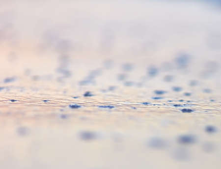 An extreme close-up texture reveals tiny water droplets on a surface, with subtle colored light reflections creating...