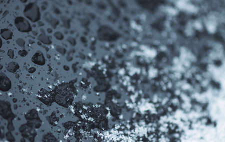 Water droplets on the metal surface in black color in close-up view, selective soft focus.